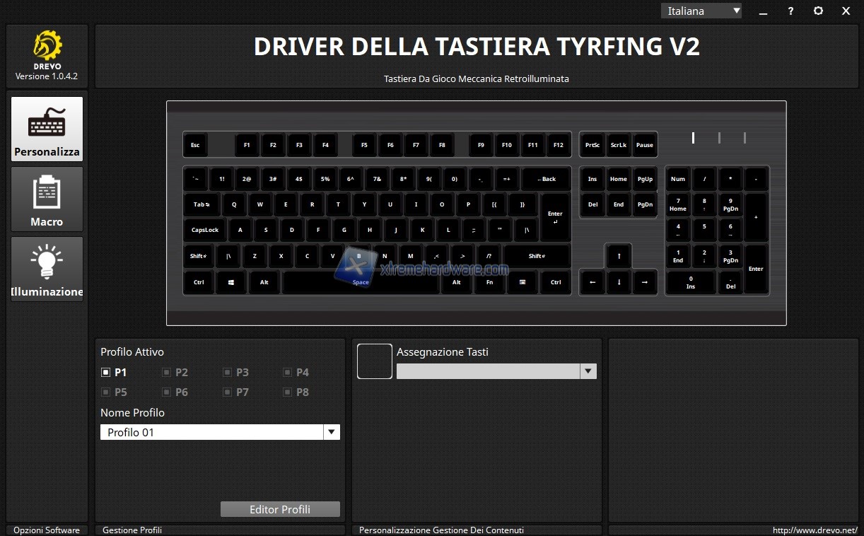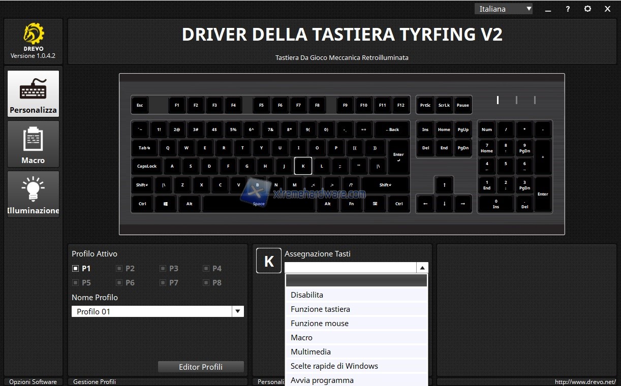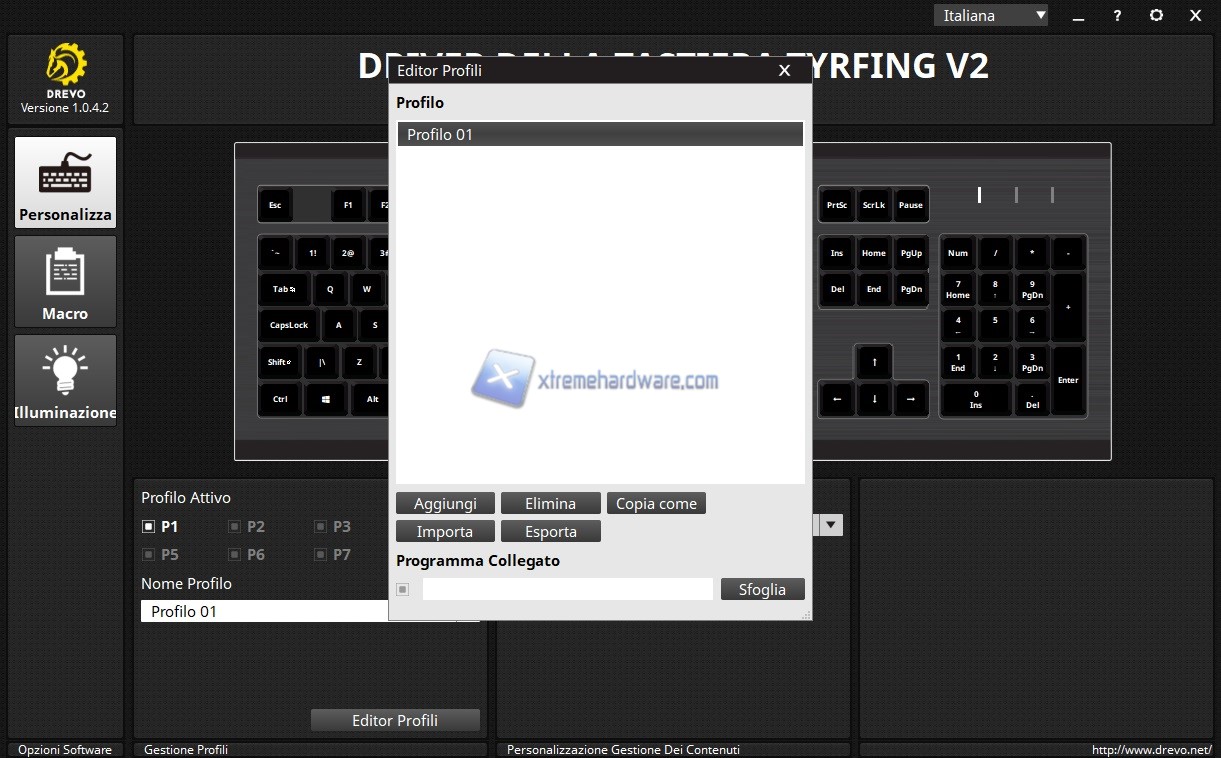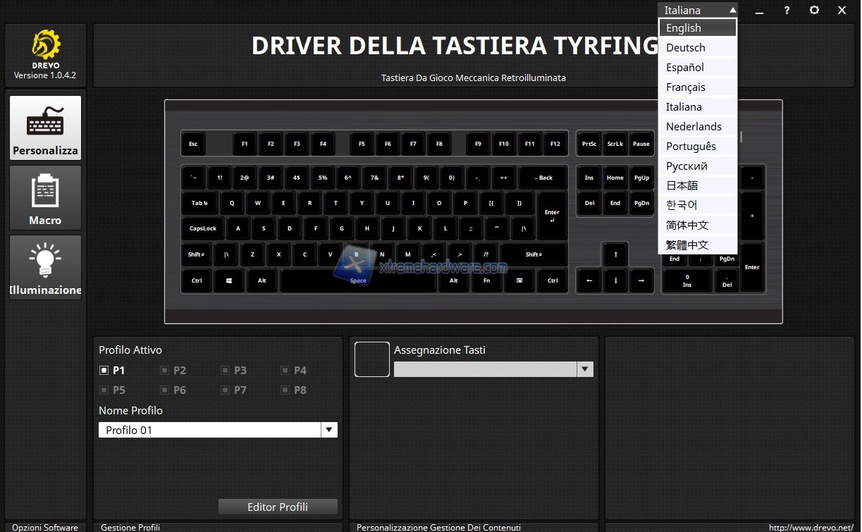 Il software della Drevo Tyrfing V2 si presenta con una GUI altrettanto classica e immediata. In primis abbiamo la possibilità di impostare la lingua in Italiano in modo tale da aiutare coloro che non parlano o comprendono bene l’inglese le varie funzioni (funzioni comunque davvero semplici e chiare).
