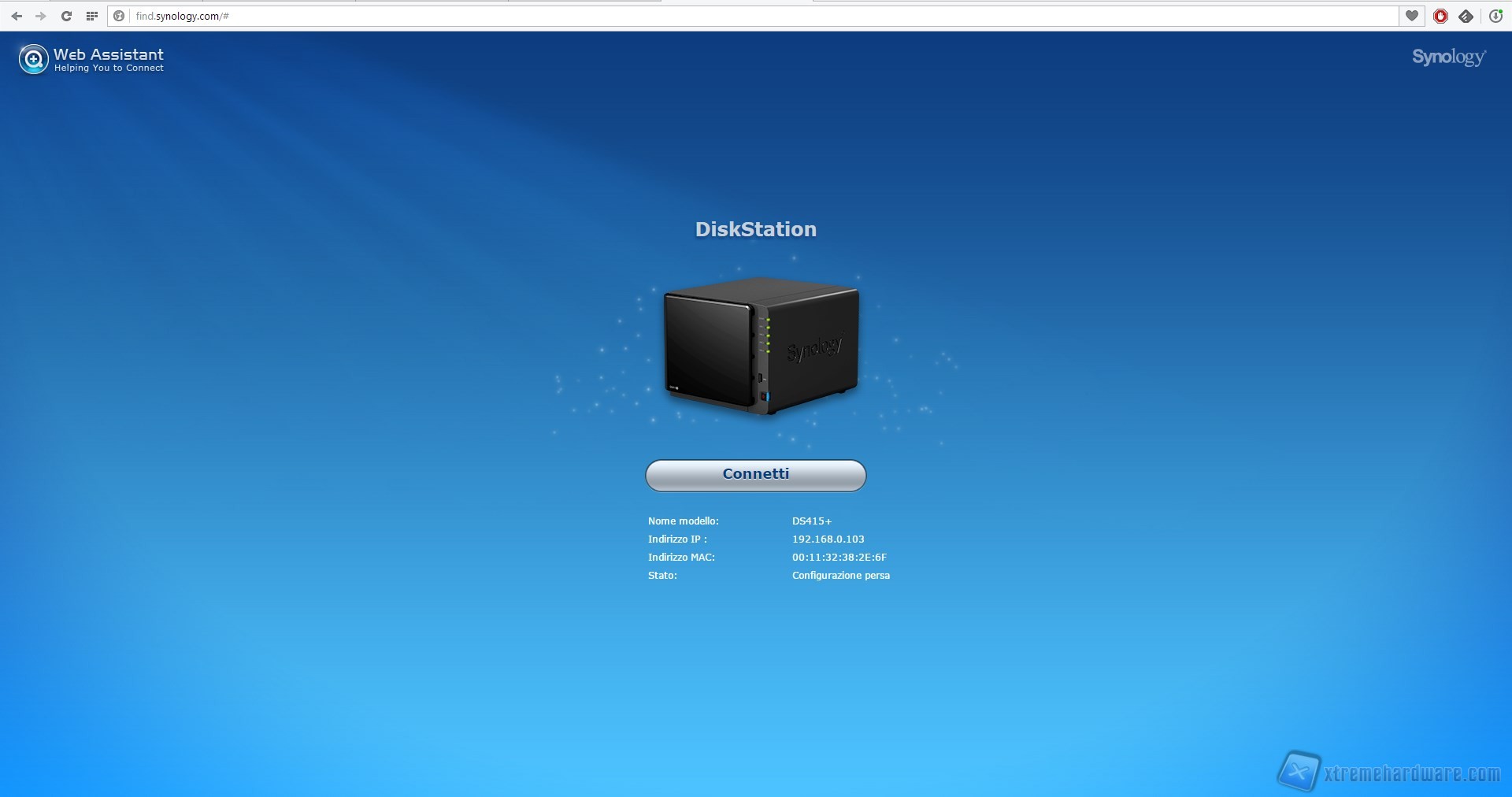 Configuriamo dunque il nostro DS415+ andando sull'ormai straconosciuto indirizzo: find.synology.com dove il sistema riconosce il nostro prodotto e inizializza la procedura di set-up.