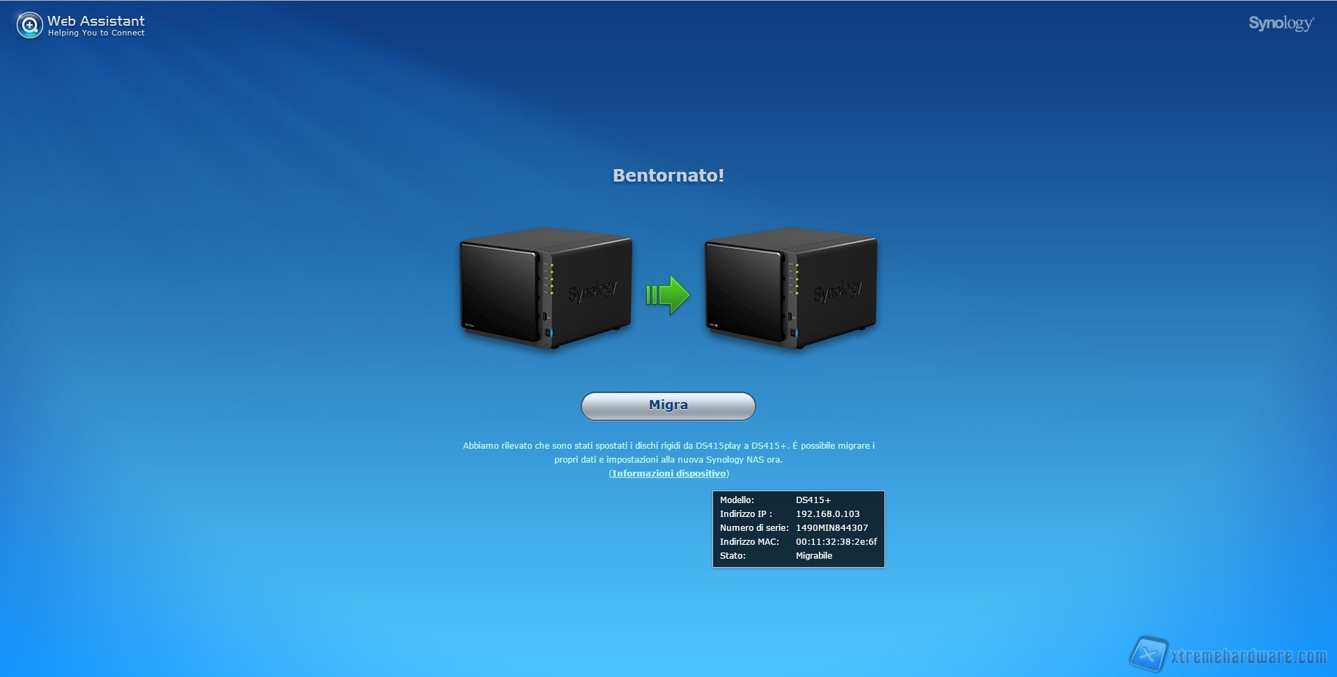 Come potete notare dall'immagine sottostante il software ha riconosciuto all'interno dei nostri dischi una precedente installazione del DSM relativa al DS415play che avevamo recensito mesi addietro e ci chiede se vogliamo migrare il contenuto nella nuova soluzione DS415+.