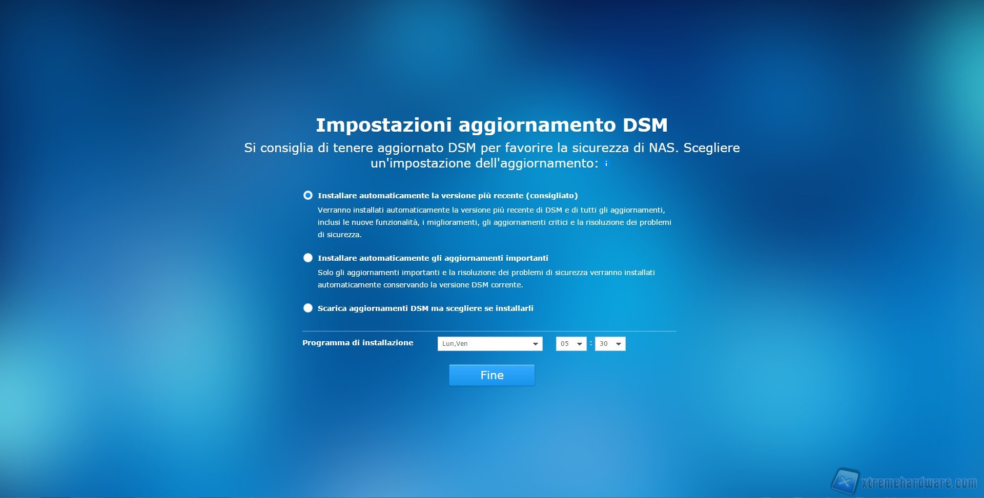 Finita la configurazione il sistema ci chiede se vogliamo abilitare l'aggiornamento automatico del DSM od eventualmente pianificare quando effettuare tale operazione.